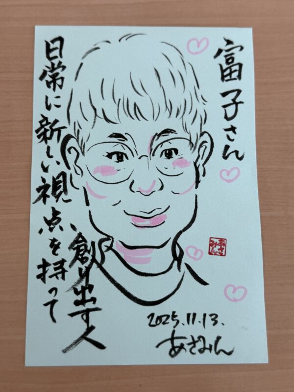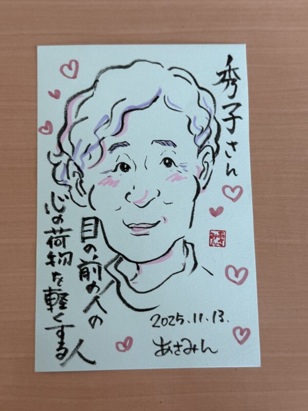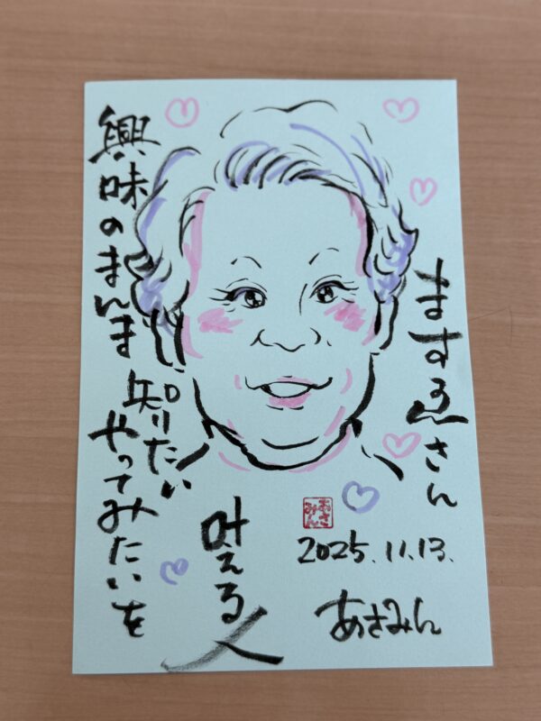 今日は、月に一度のデイサービスさんでの似顔絵ボランティアの日。毎回ここに来ると、心の奥がじんわり温まるんよ。